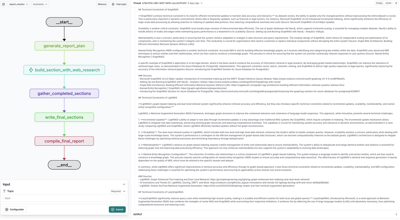 Running a report directly in Langgraph Studio shows each section following template instructions, with intros and conclusions integrating all sections. While this method may not suit those requiring cross-referencing between sections, customization can address this need.